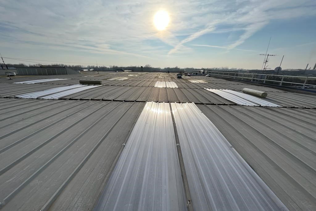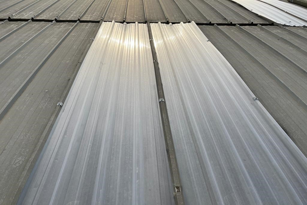 E' stato utilizzato un elemento di copertura traslucido in policarbonato microalveolare, disponibile per tutte le sezioni di pannelli in poliuretano e lamiere grecate presenti sul mercato.